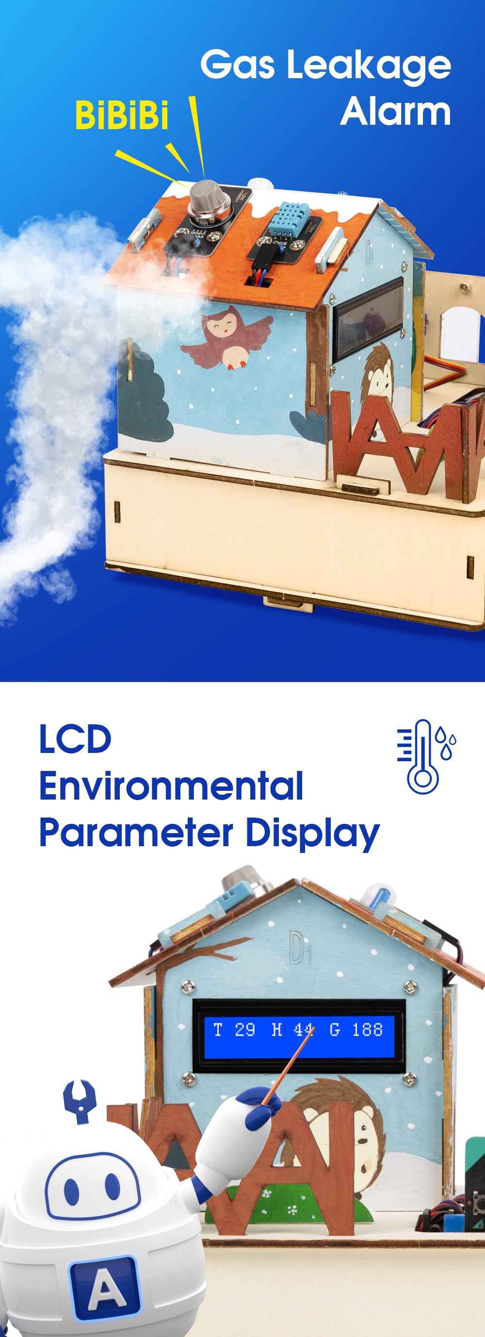 - Multi-functional Design: Packed with features like alarms, music play, music rhythm light, customizable emoji on screens, LCD display of temperature, humidity and gas detection, PIR human sensor light and touch control the light. Easy to charge and monitor battery levels.